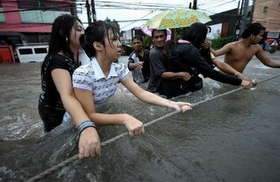 Filipino pedestrians cling to a rope as they brave floodwater brought by Tropical Storm Ketsana in Quezon City. Overwhelmed Philippine authorities appealed for international aid Monday as the death toll from once-in-a-lifetime floods soared to 140 and weary survivors sheltered in squalid conditions.(AFP/File/Jay Directo)
